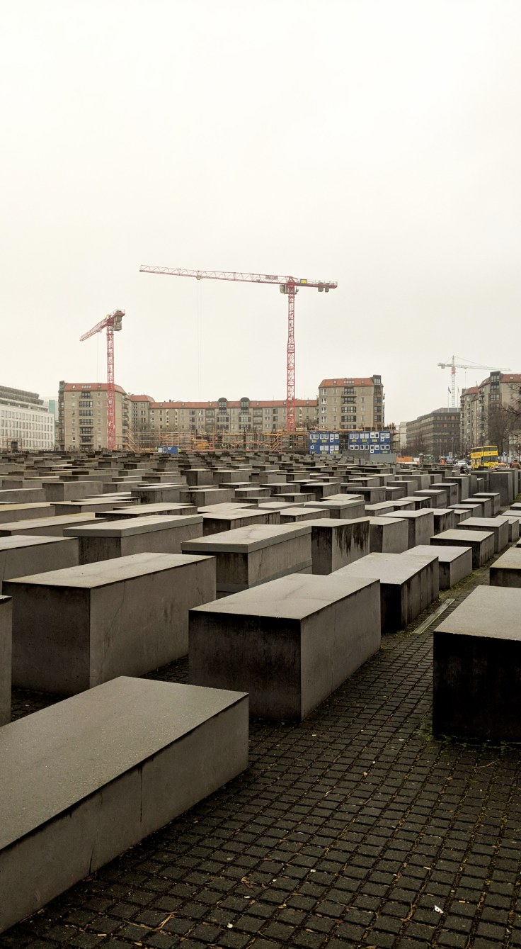 Just beyond Alexanderplatz, across the road with BMWs and Volkswagons motoring by, I came across an expanse of concrete coffins. In the cold grey afternoon, I did not have to guess what they were. I imagined there would be names listed, followed by hyphenated dates. The usual oversized, ostentatious, inadequate national apology for lost lives. None of the drivers in the cars that passed me seemed to be paying particular attention to those tombs except as another traffic light to navigate through.