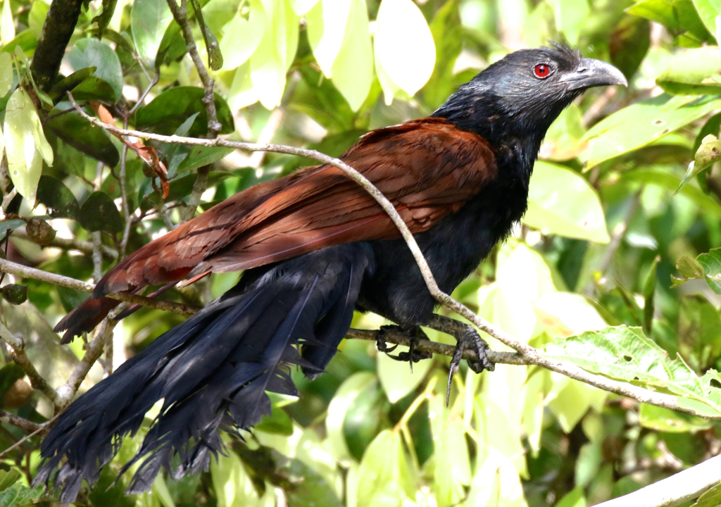 The greater coucals have just a few colors they proudly wear: strong, glossy black feathers with a distinctive Cinnamon Orange back. The adult birds add to the menace with a crimson eye, which is especially conspicuous, given the dark background of its head. They have a corvine appearance. They look intelligent and have curved, strong beaks. They are, however, part of the Cuculidae family. They went by the bridging nomenclature of crow-pheasant, which I think is an absolute banger of a name that pays homage to its appearance but completely misses the biological taxonomy.