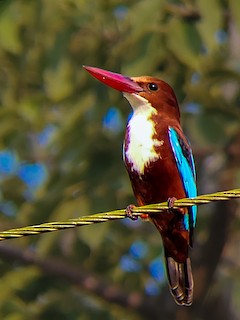 White-throated kingfishers have supremely blue tints, warm chestnut wings, thick red beaks, and short feet.