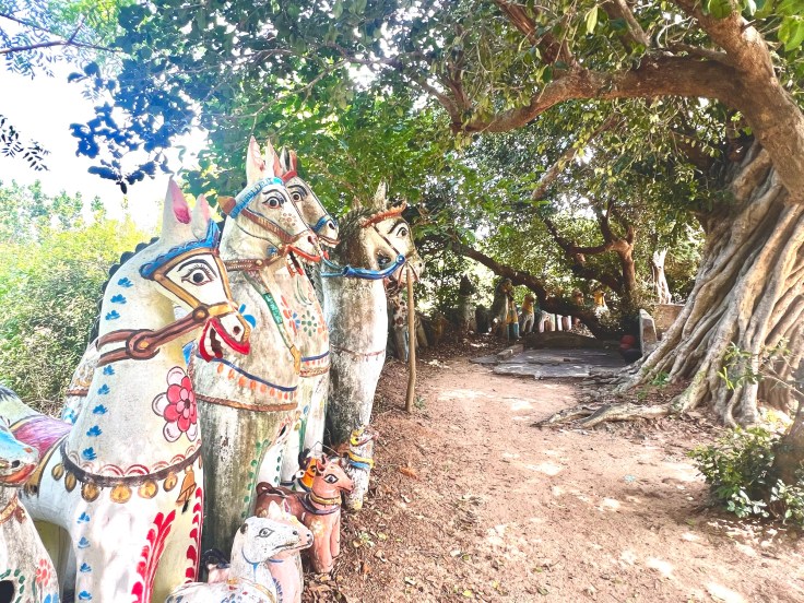 At the foot of the hills was a small Ayyanar temple. Terracotta horses were lined up under the leafy banyan tree. Pre-Vedic sentinels. Offerings of local potters and clay workers.